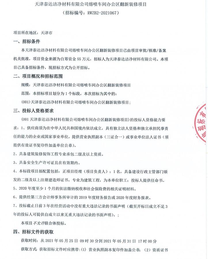 熔喷车间办公区翻新装修项目招标通告